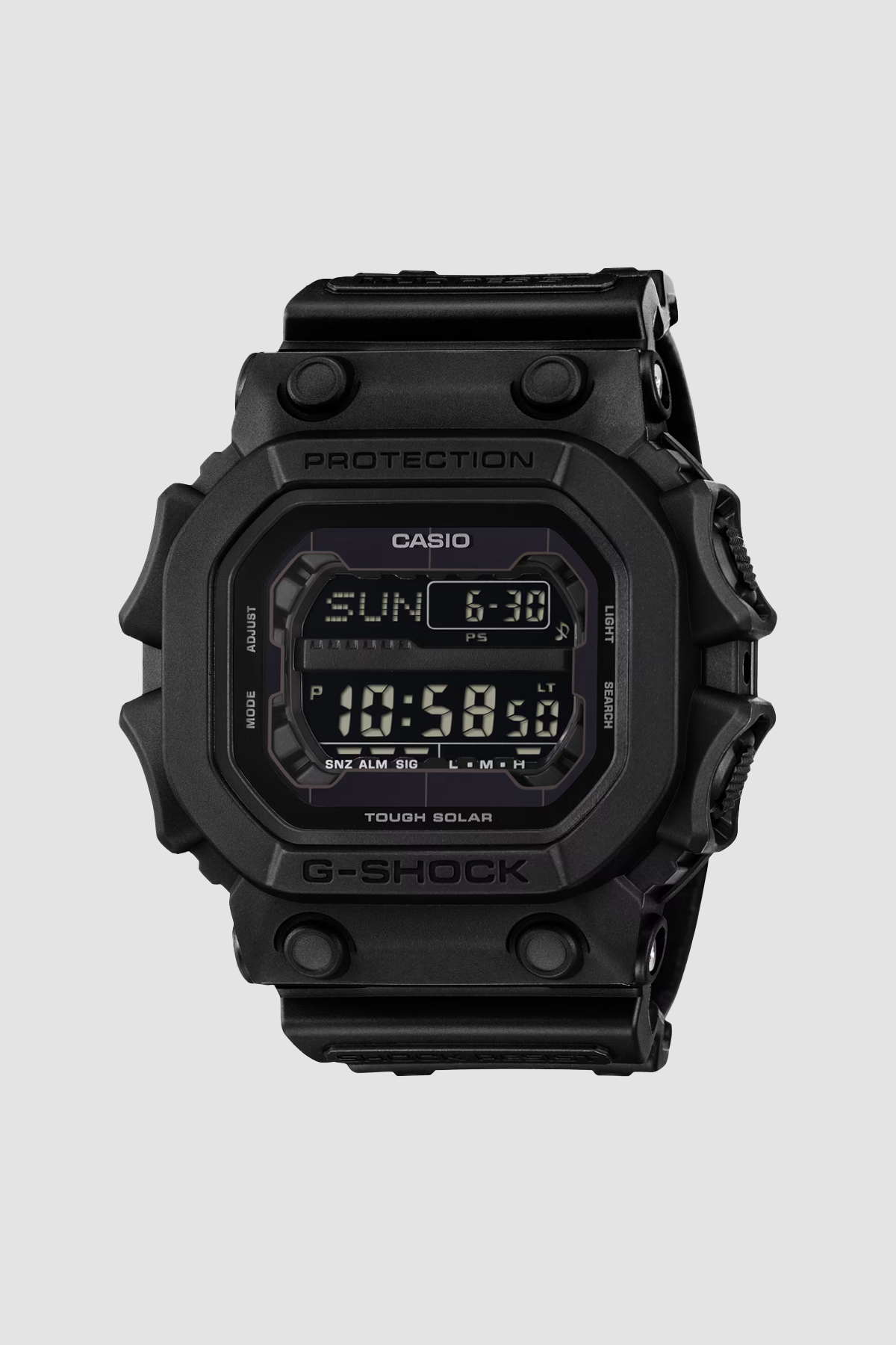 Go from strength to strength with a bold and confident statement in G-SHOCK black — an all-black design that plays up the watch’s unique resin texture. The unique GX-56 form, designed to withstand impact from all directions, is finished in a simple matte to highlight its singular contours. The high-brightness LED backlight ensures visibility even in the dark.