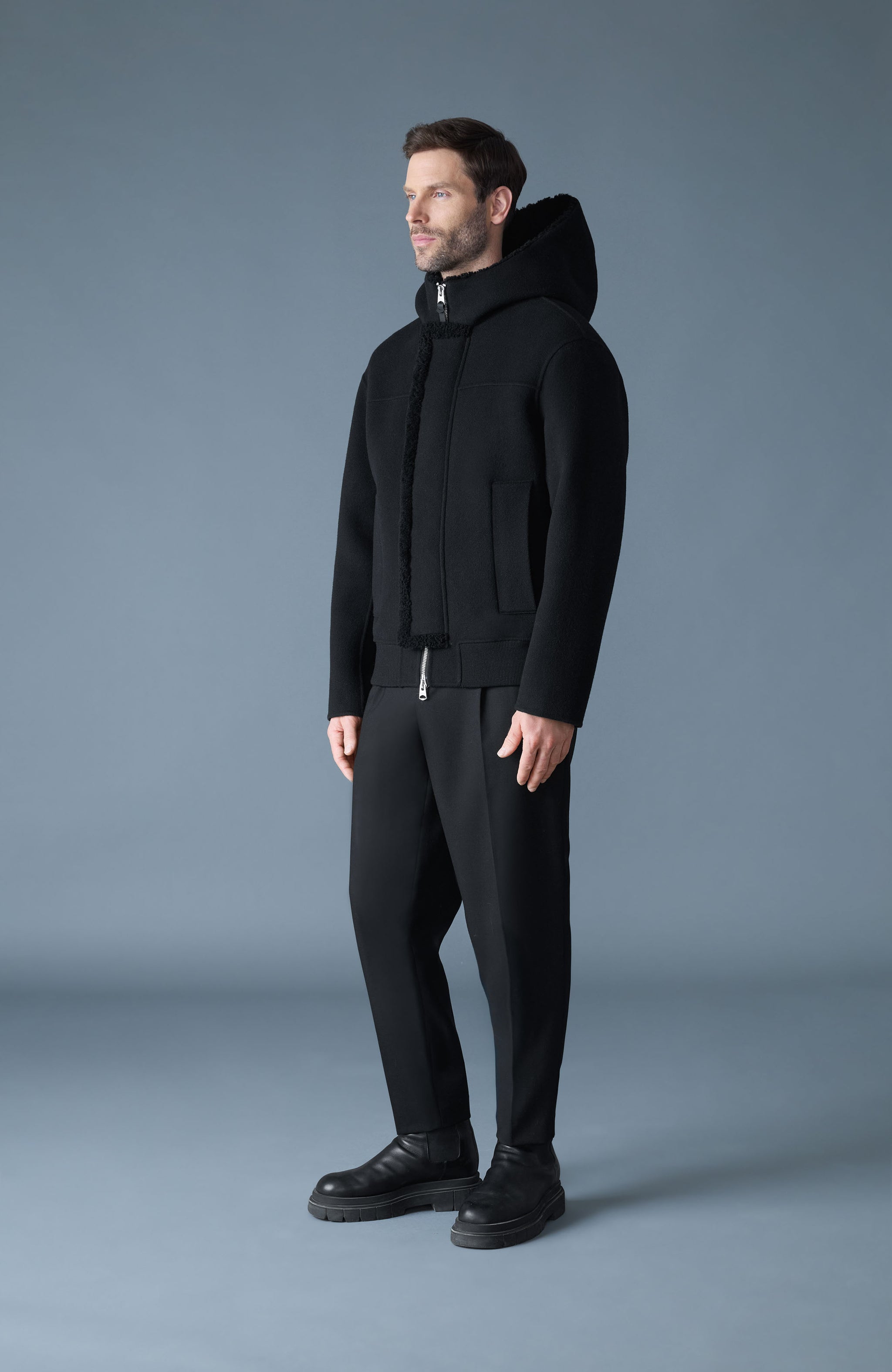 • Heavy double-face wool jacket with shearling-lined hood